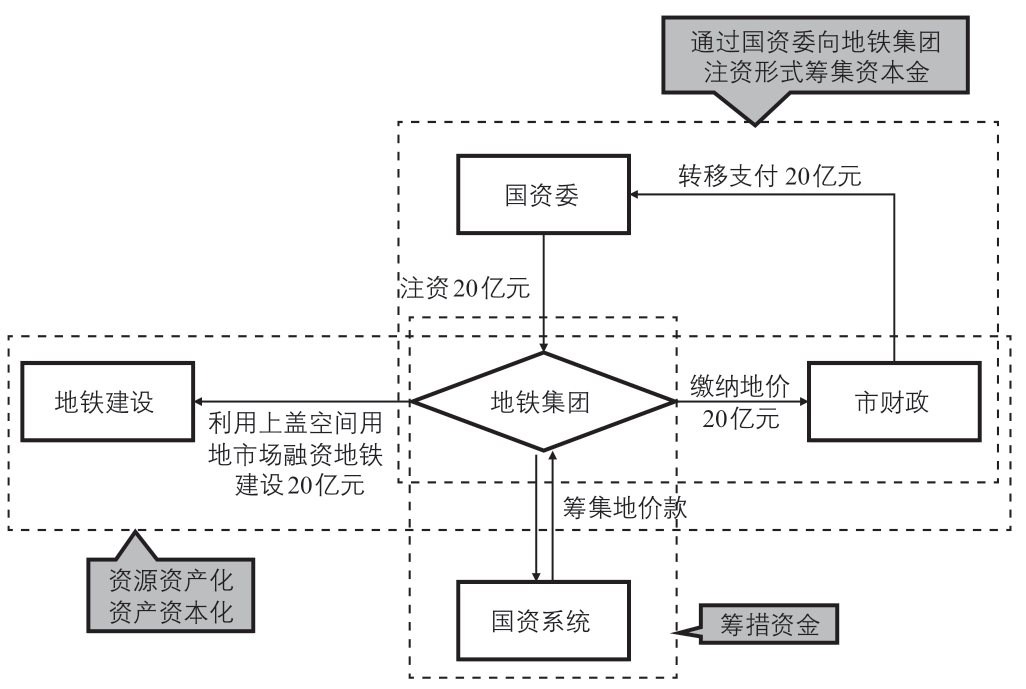 定向招拍挂指的是通过特定资格的设置,使得“招拍挂”过程中只有一家符合要求的单位参与竞标并最终中选。轨道交通领域的土地捆绑出让过程中,通常将具有地铁线路和附属设施建设经验作为参与的附加条件。这种量身定制的招拍挂行为,是政府在现有土地管理法约束下的变通,也是为保障轨道建设主体顺利获得综合开发用地而采取的保险做法。从操作来看,这种方式最易执行。不过,如果条件设置不当,也可能会涉嫌违反《招拍挂出让规定》中相关条例和《招标法》相关规定,因此需要注意捆绑条件的设置。此外,这种定向招拍挂方式也存在某种不确定性和滞后性,会带来规划和综合开发上的被动。也有城市在后来的实践中抛弃了这一做法,比如深圳轨道二期前期融资阶段,由于建设所需资金量增大,单纯依靠政府财政已难以为继,政府便通过定向招拍挂的方式将车辆段等相关用地以低价出让给地铁公司。但其本意其实是将上盖空间或沿线用地作为资本金直接投入地铁公司成为其资产。但是,受“招拍挂”制度的束缚,需要地铁公司先缴纳地价再通过市财政返还。《深圳市轨道交通三期投融资方案专题研究工作建议报告》指出整个过程实际上是以空转形式完成的,程序繁复(图1)。因此,随着后来土地出让制度的进一步创新,定向招拍挂的方式也不再是地方政府的最优选项。