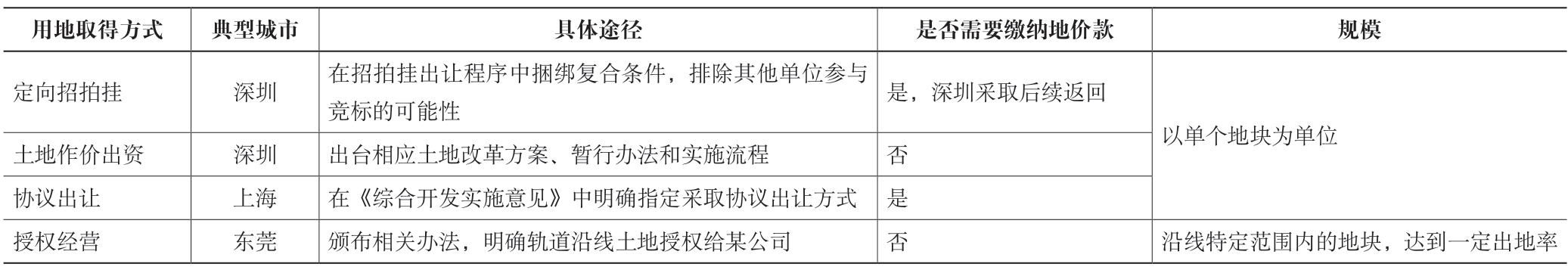 鉴于轨道的巨大融资需求和政府财政支持乏力,越来越多的城市开始由原先的财政补贴转向“以地养铁”的模式。目前虽然也仍有城市设立专门的轨道建设专项资金,以保障轨道建设运营的资金需求,但“以地养铁”已是大势所趋。那么在这个过程中,如何在相应制度和法律框架下,让轨道建设主体顺利获得上盖或沿线土地的一级使用权,就成为这一制度创新的关键。香港“轨道+物业”模式中,港铁公司通过特许经营权从政府手中低价获取地铁沿线物业和土地的开发权,然后招商进行物业开发,其过程较为直接。根据我国《物权法》相关规定,轨道交通设施用地属于公益性用地,而其上或沿线用于物业综合开发的用地则为经营性用地,这种二重性使得两者需分别通过划拨和公开“招拍挂”的方式出让。这一制度限制不仅令轨道建设主体陷入了市场竞争的漩涡,还给土地的获取和开发效果带来了极大的不确定性。以“招拍挂”方式出让沿线物业用地,将无法确保轨道建设主体获得用地,即使由其获得,也可能由于支付的金额过高而与综合开发本身的溢价反哺目的背道而驰,且会一定程度上增加其融资负担。部分较早开展轨道交通建设的城市,已经通过创新摸索,逐渐形成了一套适合自身城市的土地取得对策。总体上,可主要分为以下四种方式,即定向招拍挂、土地作价出资、协议出让以及授权经营(表5)。