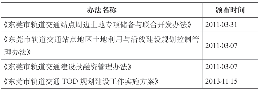 东莞作为国内轨道交通建设的新进城市,在总结前人经验的基础上,结合自身需求推出了一套相对系统的TOD 规划和综合开发策略[25]。东莞由于镇村二元的土地管理模式以及“自下而上”的城市开发导致的土地粗放式利用,需要其在规划编制之前对市域范围内土地展开额外的全面排查,将轨道影响区域内,包括市属、镇属、村属空置土地、低建筑密度土地、批而未用的空闲土地,都纳入储备范围。东莞在规划编制和综合开发上还分别牵涉区级政府、镇级政府等多个主体的参与,因此通过相关政策的出台来明确并保障多主体参与下的TOD 规划与综合开发实施和土地整备工作,便成为必要手段(表3)。这对能级较小的二三线城市进行TOD 综合开发实践有着重要参考价值。