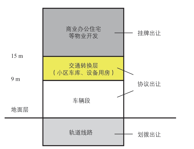 根据地铁建设和运营需求,每条线路都至少配备一个车辆段作为停放或整备、检查的空间,而车辆段、停车场用地往往占地较大,与国内城市日益紧缺的土地资源供给形成了矛盾。于是在过去的十多年时间里,国内许多城市,特别是特大城市,都对轨道车辆段的复合利用开展了一系列实践,并且在增量综合开发规模中占据了较大比例。在车辆段开发中,开发难点在于如何突破公共设施用地的法定局限和厘清各部分空间的使用权,赋予土地复合功能并对土地进行集约利用,这也是土地整备工作的一种延伸。《物权法》第一百三十六条提到的地表、地上或地下分别设权的规定,以及深圳市前海湾车辆段上盖“分层设权、分别供地”的做法已经分别从法律和实践层面为供地尴尬破了局。在深圳前海湾车辆段中,三类不同的功能的空间使用权针对不同的使用主体分别采用了招拍挂、协议出让和划拨三种方式[29](图3)。不过,具体到各城市某个特定车辆段(停车场)的上盖开发,还是需要结合其所在的城市环境综合设计,制定开发强度、分割空间和安置功能。