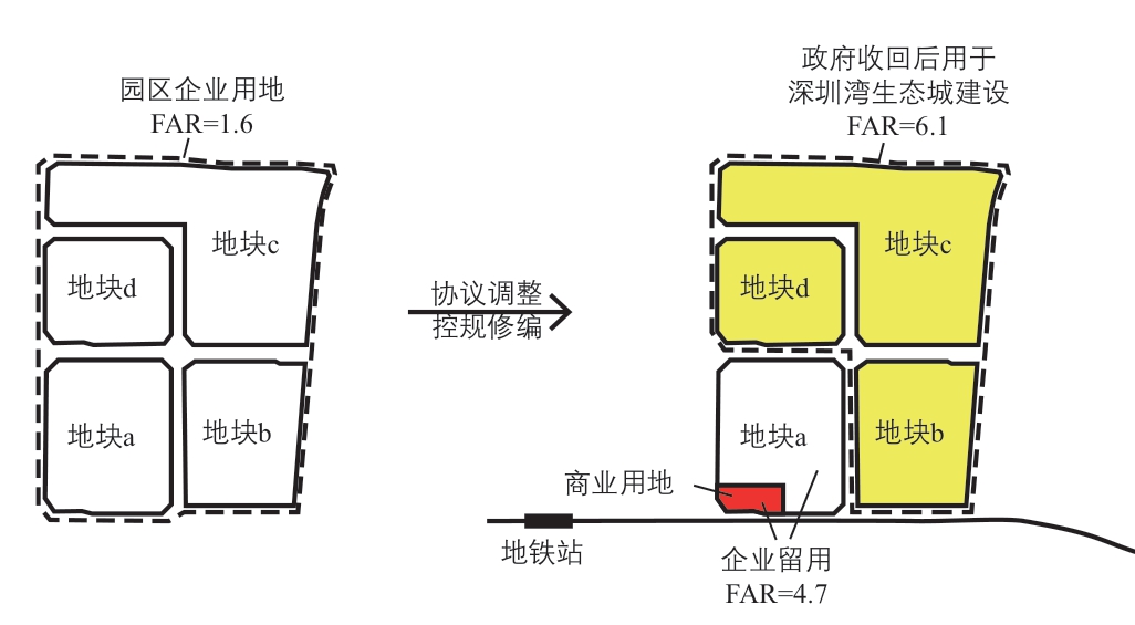 在国内,虽然还没有专门针对轨道与土地一体化开发的法规,但是轨道建设时要求对控规做相应调整的做法正是为捕获增加的这部分价值,现有的土地管理法与土地使用权转让条例当中也有涉及土地收回或置换的相关规定。比如:我国《土地管理法》第五十八条、《城市房地产管理法》第二十条与《镇国有土地使用权出让和转让暂行条例》第四十二条中均明确指出,对于已经公开出让的用地,出于公共利益确需使用土地的,可依照法律程序提前收回土地,并按照实际情况对土地使用权人进行相应的补偿。在国家层面这一系列法规的保障下,深圳等城市也针对自身的实际需求采取了一些规定和用地调整指引。对于轨道影响范围内已批未建的用地来说,由于施工还未展开,调整的成本相对较低,因此可以争取通过政府与开发主体之间的协商,使地块性质与未来开发强度都尽量符合TOD 的发展预期。如深圳湾生态城项目中涉及一片原企业园区用地,该地块区位条件优越,但其早期图则编制时设定的容积率较低,仅为1.6。2010 年政府相关部门便与该地块的持有方达成协议,将园区三期用地25.4 hm2 土地中的20.3 hm2 无偿交还深圳市政府相关部门。作为交换条件,开发方以补地价600 元/m2 的方式保留总面积仅为原来1/4 的地块,容积率提高并增加0.66 hm2 商业用地,同时,政府将收回的土地容积率提高到6.1(图4)。