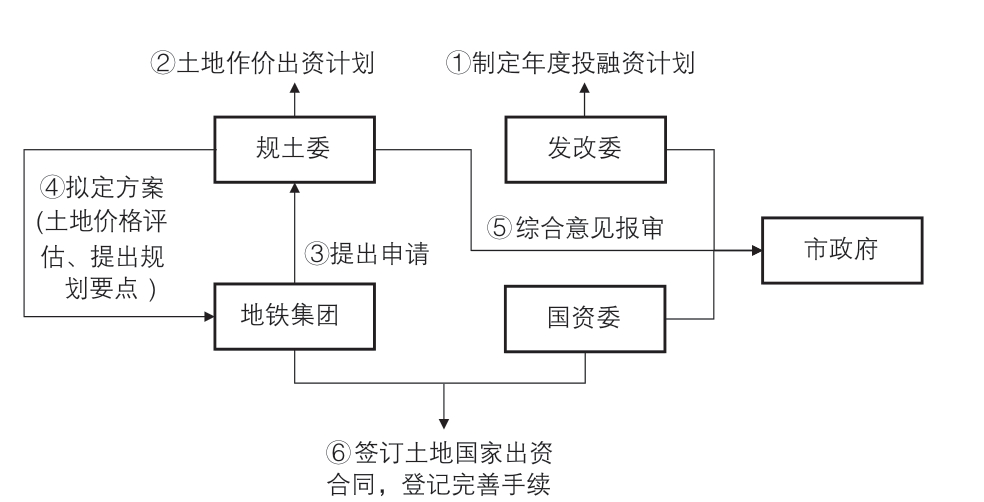 鉴于定向招拍挂存在的一系列问题,深圳市在轨道三期时针对用地取得方式进行了新一轮改革。土地作价出资最早由深圳提出,是对国土资源部提出的土地资源、资产、资本管理新模式的积极探索和实践。依据《公司法》第二十七条的规定,深圳采取了将土地使用权作价入股的创新方式,即在经土地评估机构市场估价后,政府以资产入股的方式将拟入股地块的土地使用权直接投注给轨道交通集团,由轨道建设主体进行市场化运作。同时,该土地使用权相应的股权则由政府委托某国有企业(如城市基础设施投资公司)持有或由国资委持有(图2)。从2012 年5 月出台《深圳市土地管理制度改革总体方案》和《深圳地铁三期轨道交通建设规划》提出以土地作价出资解决地铁三期相关建设资金的融资方式,得到国家批复,到2013 年颁布《土地使用权作价出资暂行办法》《作价出资实施流程》和《作价出资合同(范本)》相关文件,前后历时整整一年[24]。不过,这一创新探索确实为之后其他城市的综合开发用地获取提供了有益的参考基础。目前来看,土地作价出资这一方式具有较强的实践性,不过操作中应当按照法定流程进行地价评估,并完善相应手续。