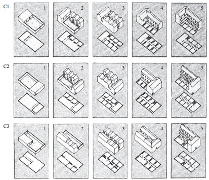 解决上述两个问题(图 1)。按照结构主义思想方法,“过程的类型”并不是研究每个类型的分类问题,而是探寻各种形态类型深层结构的发展演变规律。如意大利学派学者阿蒂利奥·彼得鲁乔利(Attilio Petruccioli)通过图示阐述罗马泰伯地区住宅类型的演变过程(C1-C3),从最初阶段1的一层独栋住宅; 到阶段2增加联排住宅; 阶段3形成两排联排住宅; 阶段4形成多个楼梯的通廊式住宅; 阶段5形成单一楼梯的通廊式住宅。由于地块内最初建筑形态不同,以后的演变也各有差异,但从阶段1到阶段5却具有相同的变化规律,C1-C3的演变过程是同一种“类型”,即相同的“过程的类型”[9]。