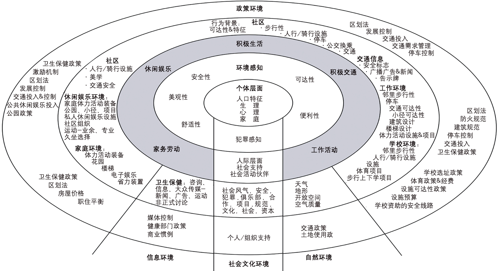 1990 年代末,美国加利福尼亚大学詹姆斯·萨利斯(James F. Sallis)教授等在综合多个领域研究发现的基础上提出了基于行为研究的积极生活生态模型(Ecological Model of Active Living)。将建成环境对体力活动的影响因素归纳为可达性、便捷性、舒适性、观赏性和安全性五个方面,并就居家、休闲、工作和交通环境提出了可供观察的空间要素[12]。该模型较系统地阐述了与行为相关的环境要素,将个体的行为与建成环境中的活动空间联系起来,并细化了功能空间的类型和层次,为系统理解环境要素对健康的影响提供了结构化的认知框架,从而为实施干预提供了依据(图3)。