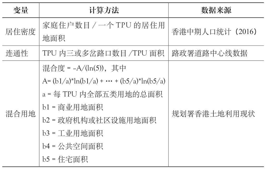 本文结合文献综述,采取专家访谈的方式,并选取了三个表征社区易行性的变量,即居住密度、道路连通性及用地混合度进行研究。专家访谈以焦点小组的形式进行。除本文的两位作者外,专家包括一名英国顾问公司规划部的董事、一名本地研究院从事规划设计的项目经理、一名本地规划师以及一名城市规划专业的研究人员。焦点小组分两次进行。首先,作者简述已有关于易行性的测度指标。不同专家根据香港的实际情况以及数据的可获得性讨论适合香港且用于评价易行性的用地指标。在讨论中,作者剔除了零售业容积率变量,因为商业楼宇容积率普遍很高。地区与地区之间存在零售业多少的差别,不存在容积率高低的差别。因此用地混合度已经可以反映零售业这一指标。第二轮焦点小组旨在讨论和解释计算结果,尤其是从香港城市规划的视角讨论产生不同易行空间的原因以及不同的规划范式,并提出一些建议。数据以香港的小规划统计区(TPU)为单位。TPU 并不是一个行政区,而是为城市规划的制定而划定的单元。2016 年全港18 区共有291 个TPU。大多数TPU(尤其是由居住用地的TPU)的尺度和社区尺度接近。不同TPU 的易行性和社会经济指标可以进行比较。表1 是各项数据的算法和数据来源。其中,在计算混合用地时,考虑了五种用地类型,即商业(商业/商贸和办公室)、政府机构或社区设施、工业用地、公共空间、住宅。对于每一个TPU,三个变量的数据标准化后(求z-值)求和,即为其易行性。分数越高代表越适宜步行。