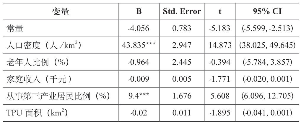变量B Std. Error t 95% CI常量-4.056 0.783-5.183 (-5.599, -2.513)人口密度(人/km2)43.835***2.947 14.873 (38.025, 49.645)老年人比例(%)-0.964 2.445-0.394 (-5.784, 3.857)家庭收入(千元)-0.009 0.005-1.771 (-0.020, 0.001)从事第三产业居民比例(%)9.4***1.676 5.608 (6.096, 12.705)TPU 面积(km2)-0.02 0.011-1.895 (-0.041, 0.001)