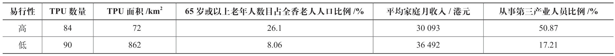 笔者将易行性1~4 的TPU 归为低易行度区,7~10 为高易行度区,并将两区的社会经济指标加以比较(表2)。总体而言,高易行性地区面积比较小,分布于市中心,居民大多从事第三产业,平均收入不高。全港有26.1%的老年人居住在高易行性地区。
