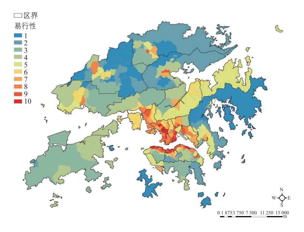 笔者将全部TPU 的分值从低到高排序,并赋值1~10(对应于10%、20%,以此类推)。图1 是可视化后的全港易行地图。可以看到,市区(即港岛区和九龙区)易行性普遍较高。易行性最高(10 分)的TPU 分布在中西区、湾仔、油尖旺、九龙城和深水埗。而易行性最低(1 分)的TPU 分布在新界元朗、大埔、北区、西贡和离岛区。新市镇的易行性通常较低,原因是大部分新市镇虽然居住密度比较高,但每一个地块较大,混合用地程度很低。新市镇内部地铁站附近易行性较高,这与香港的“地铁+物业”的联合发展模式有关。地铁公司在开发新线路的同时,拥有站点附近土地的使用权。这种土地发展模式既可以使地铁公司从房地产开发中获得收益,又促进了新市镇设施的建设。然而,大部分新市镇在规划之初都以“自给自足”作为核心规划理念,与实际用地发展存在较大偏差。根据统计,新界、九龙、港岛的第三产业的就业人数依次为666 480、402 960 和279 337 人[25]。虽然居住在新界区的居民大多从事第三产业,但大部分第三产业集中在市区,即港岛和九龙,因此大部分居民需要长距离通勤。