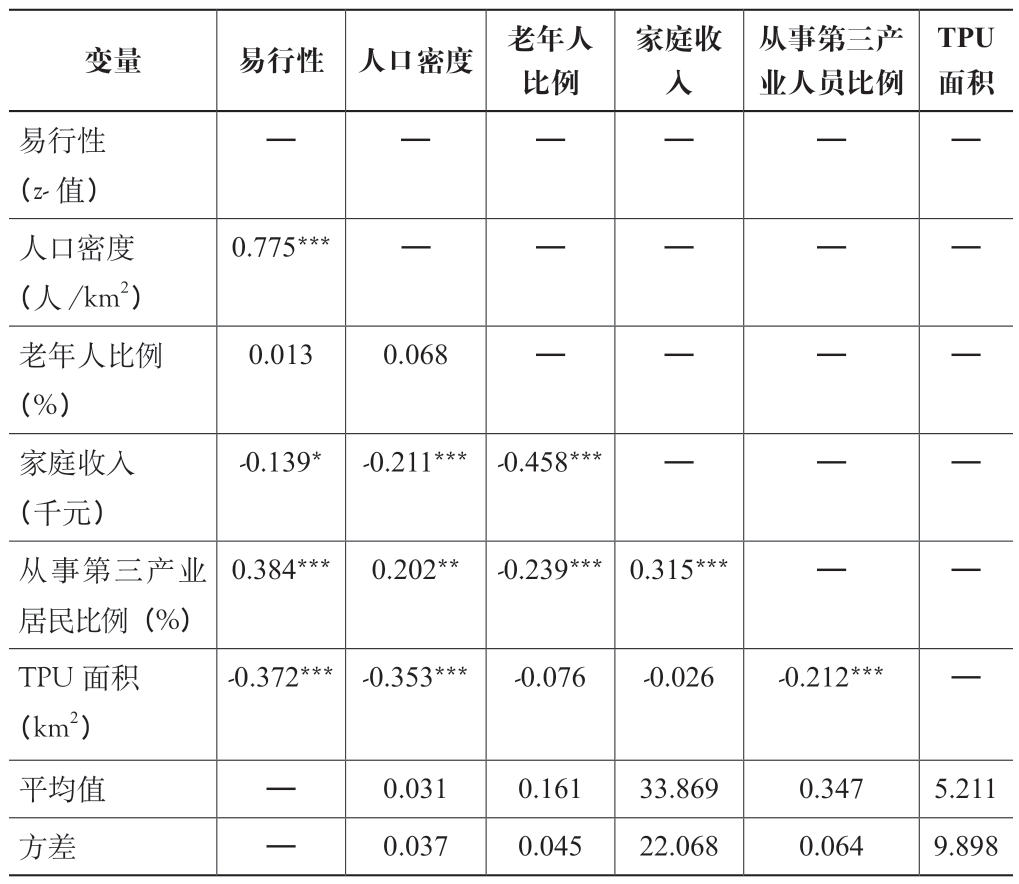 变量易行性 人口密度 老年人比例家庭收入从事第三产业人员比例TPU面积易行性(z-值)——人口密度(人/km2)0.775***——老年人比例(%)0.013 0.068——家庭收入(千元)-0.139* -0.211*** -0.458***——从事第三产业居民比例(%)0.384*** 0.202** -0.239*** 0.315***——TPU 面积(km2)-0.372*** -0.353***-0.076 -0.026-0.212***—平均值—0.031 0.161 33.869 0.347 5.211方差—0.037 0.045 22.068 0.064 9.898