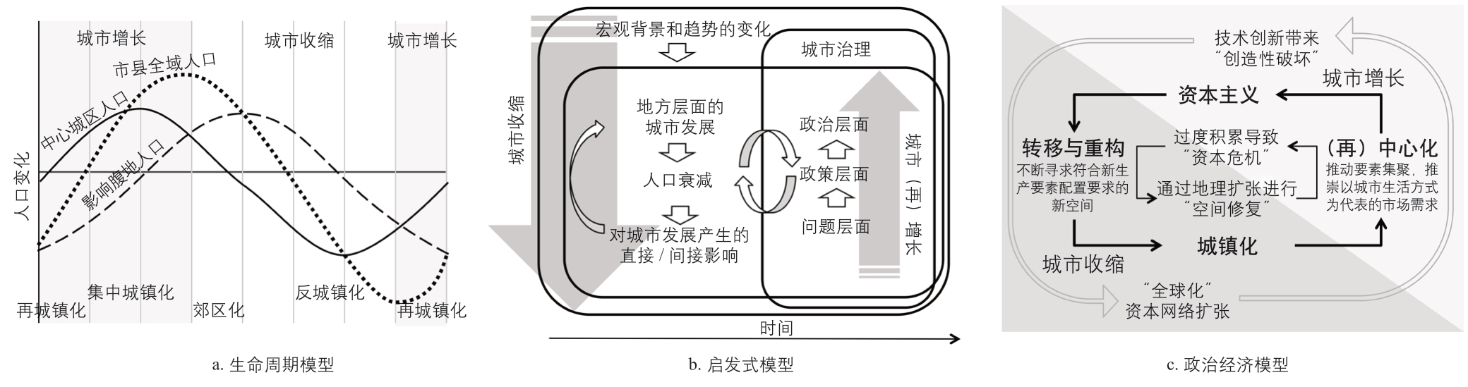 从较长历史时期看,很多城市都经历过繁荣与萧条的更替;从较大空间尺度看,很多全球性、地方性的历史过程也都伴随着城市和区域的增长和收缩。将城市增长与收缩并置,被引用最多的城镇化理论模型有三种(图1):生命周期模型(the life-cycle model)、启发式模型(the heuristic model)和政治经济模型(the political-economy model)。