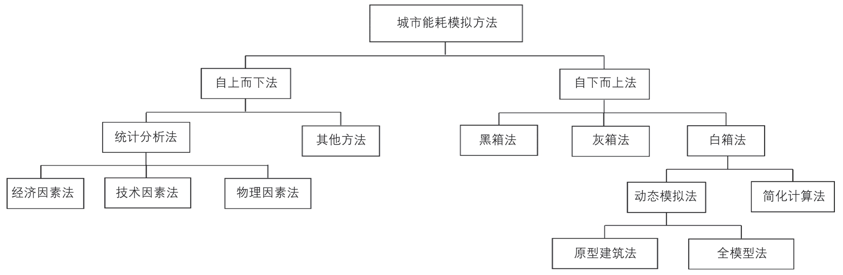 城市能耗模拟是在城市层面对能耗进行的科学计算和分析,对于研究城市能源的优化、安全、管理具有重要的基础性意义。目前,主要有两类基本模拟方法:自上而下法和自下而上法[2,14](图1)。
