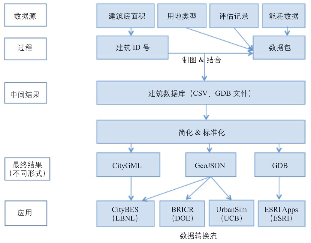 (2)数据集成。进行城市尺度的能耗模拟需要基于城市建筑多维度信息,包括表征形态的三维几何信息,以及对能耗规律具有重要影响的其他非几何信息,如人员流量、围护结构热工物理参数等。而城市能耗模拟结果将依托GIS 平台整合进入城市建筑大数据库,进一步完善城市大数据库。