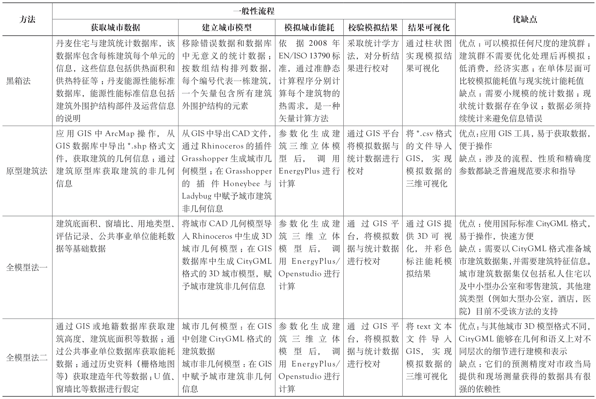 通过对上述四种城市能耗模拟方法的比较分析,可以看出城市能耗模拟的主要研究方法包括: