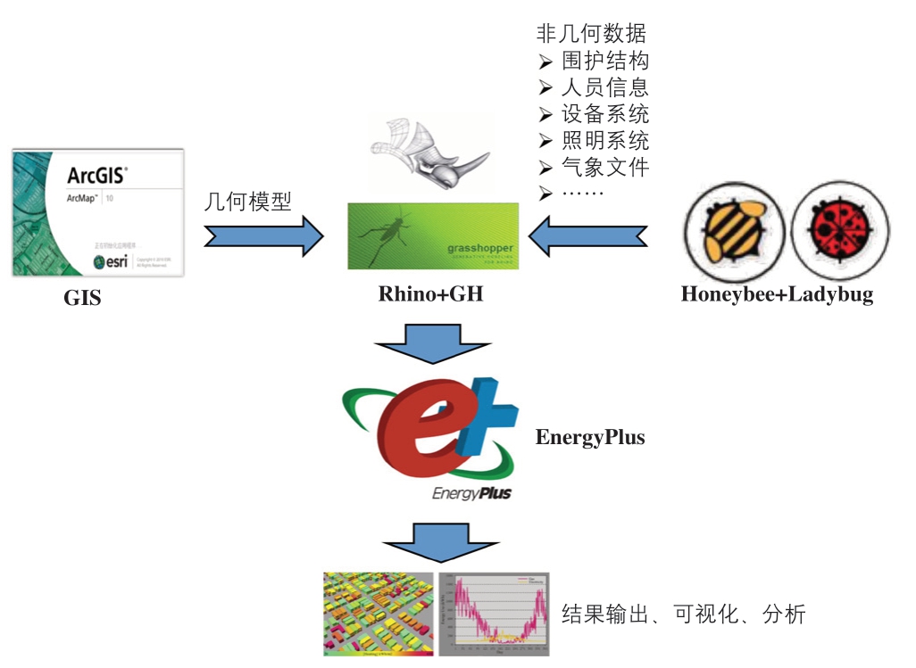 (1)软件集成。运用必要的计算机技术手段,在GIS 平台上处理城市建筑的大数据,通过合适的第三方程序,如Rhino、Grasshopper 等,实现从GIS 数据到IDF 数据的转换,从而使用EnergyPlus 对城市建筑大数据进行能耗模拟,确保计算的准确性和高效性(图8);
