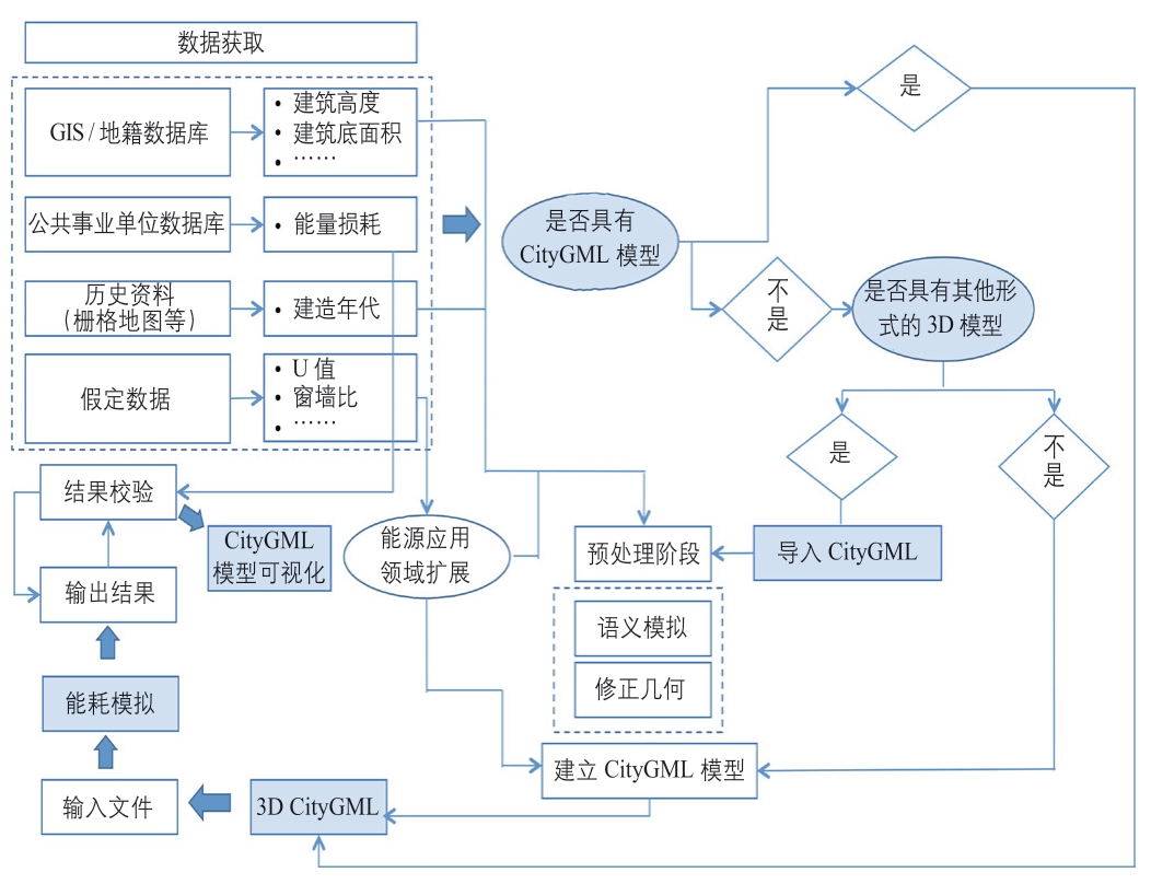 通过对目前国际上最新的城市能耗模拟方法的分析,我们发现不同的城市能耗模拟方法普遍包含五个基本模块,即获取城市数据、建立城市模型、模拟城市能耗、校验模拟结果、结果可视化。