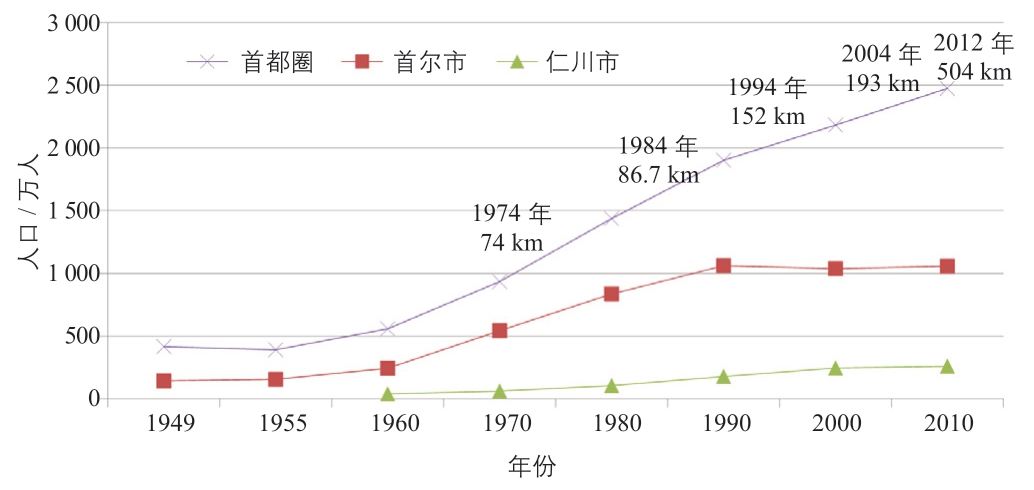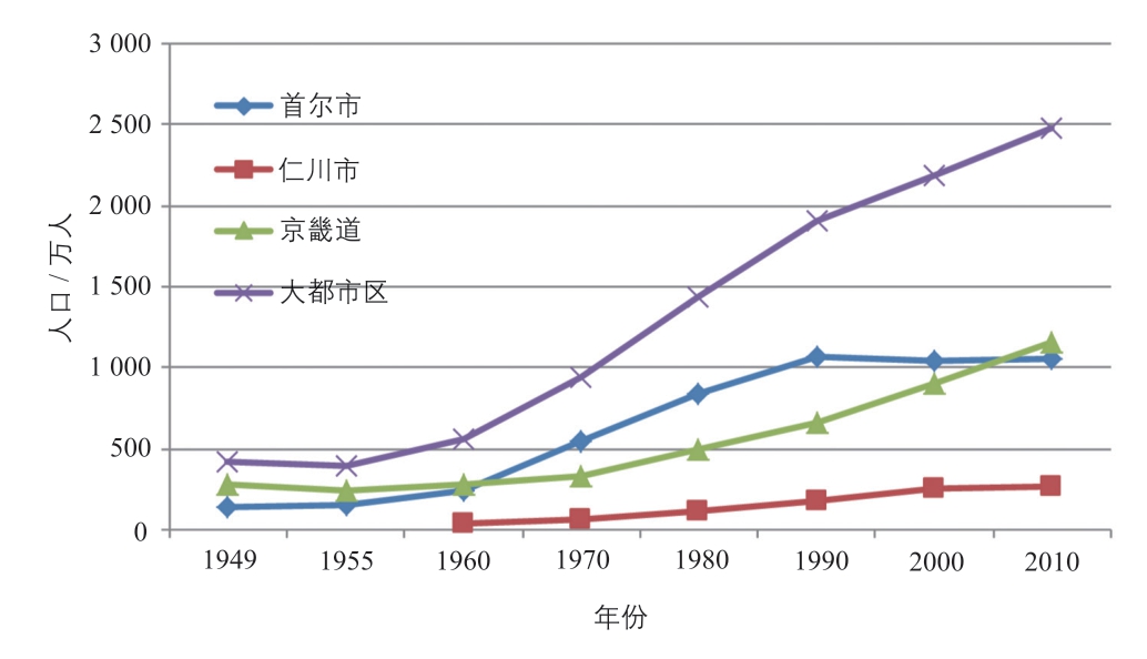 城镇密集区人口向大都市区集聚是否为普遍规律?其核心致因是什么?对于发达地区的深度解析与系统比较是社会经济系统优化的主要方法,但国内缺少对于可比性较强案例的深入解读。在世界发达地区序列中,首尔作为典型的后发大都市区,其人口腹地、发展背景、演化进程等与中国绝大多数省会城市接近①首尔大都市区人口腹地为整个韩国,其面积为10 万km2,当前人口为5 000 万人,与绝大多数中国省会城市接近;其都市区化起步于1980 年代,区域交通及其他基础设施系统的发展基础较为薄弱,显著不同于工业化历程较长的东京、伦敦、巴黎等城市,而与中国超大城市极为接近。,具有较强的代表性。本文以首尔大都市区为例,对其进行深入解读,从居住人口和就业岗位的增长及其空间分布特征着手,对其时空演变特征进行深入分析,总结其演化规律,从经济效率、交通支撑和国土开发政策等方面分析核心致因;结合中国语境研判我国部分特大城市人口集聚和职住空间的演化趋势,并提出针对性建议。