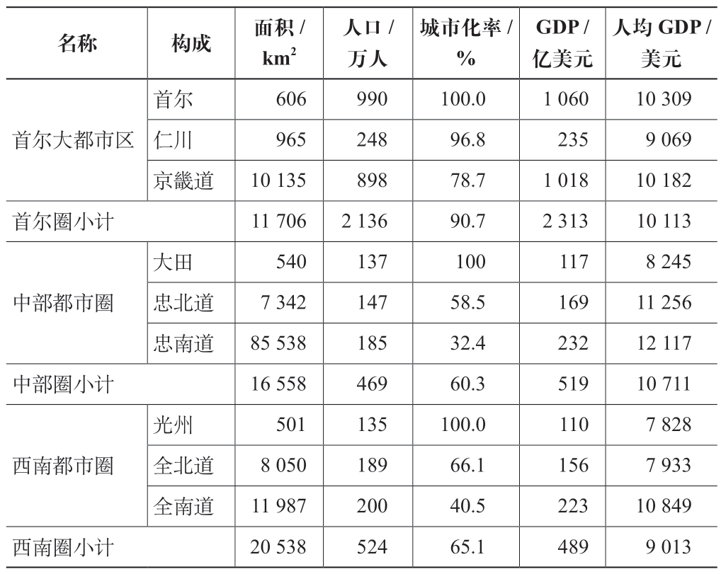 2015 年,首尔大都市区经济总量(GDP)为近7 000 亿美元,人均2.8 万美元,处于较高的经济发展水平。其中,首尔市为3 110 亿美元,人均3.14 万美元;京畿道为3 128亿美元,人均2.41 万美元;仁川市为715 亿美元,人均2.8万美元[2]。