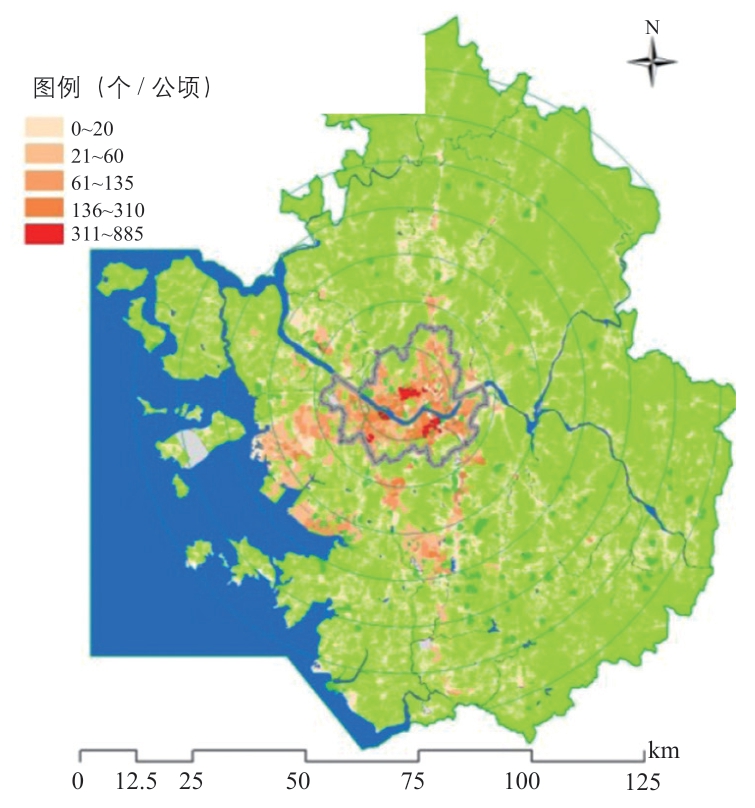 图5 首尔大都市区就业岗位密度分布(圈层级差为10 km)