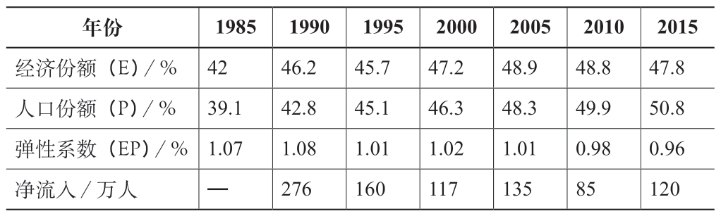 人口规模是否增长是判断大都市区是否由聚集向分散发展的重要标志。在人口可以自由流动的市场条件下,个人或家庭居住地的选择总是倾向于经济收入偏高的相对发达地区,直到地区间人均收入接近。在集体选择行为上,可用经济弹性系数(EP)来反映:EP=经济份额(E)/人口份额(P);经济份额(E)=GDPi/∑iPOP,其中i 为研究区域内统计单元的个数;人口份额(P)=POPi/∑iPOP,其中POP为统计单元内的常住人口数量,i 为统计单元的个数。