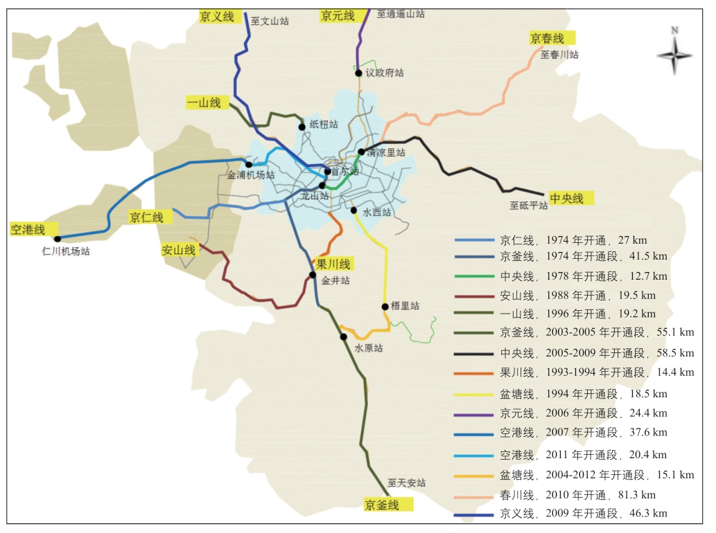 图8 首尔大都市区轨道交通线路的建设年份与布局示意图