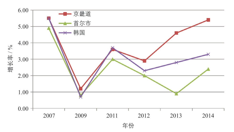 在首尔市区土地开发殆尽的背景下,京畿道和仁川地区由于拥有相对充足的可建设用地,加之人力成本较低,近来年的经济增长率一直高于首尔市及韩国平均水平。尤其是2011 年以来,京畿道经济增长率明显高于首尔市区(图7),至2014 年京畿道GDP 达到3 128 亿美元,首次超过首尔市的3 110 亿美元。与此同时,进入京畿道地区的企业数量大幅增加,提供了大量的新增岗位,2002—2014 年间京畿道新增企业7.7 万家,新增就业岗位26.9 万个,为承接新增人口提供了核心支撑。