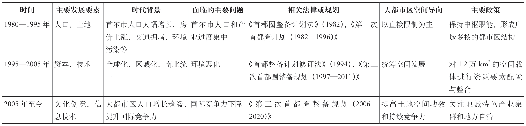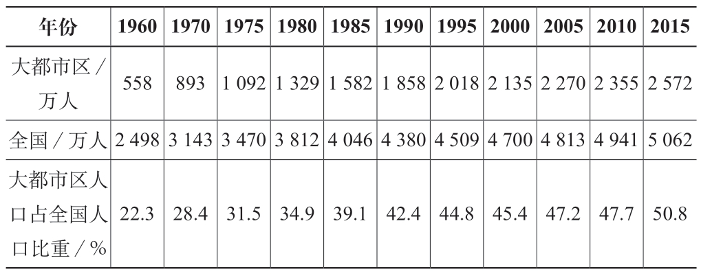 韩国在1960 年已经明确了国土均衡发展的思路,并在1963 年颁布的《国土建设综合规划法》中予以确认,后续的多轮国土综合开发规划和首都圈整备规划也一直予以贯彻和强化。但是首尔大都市区极化发展的趋势并没有发生改变,大都市区人口占全国人口比重持续升高(表1)。1990年后,韩国实施了广域圈开发政策,2000 年以来实施了第一个《国家均衡发展五年计划(2004—2008 年)》,均衡发展理念再次得到强化,加之全国城市化率达到90%,在此背景下,2005—2010 年间首尔大都市区人口增速有所降低,但在2010 年后,人口再次大幅增长。