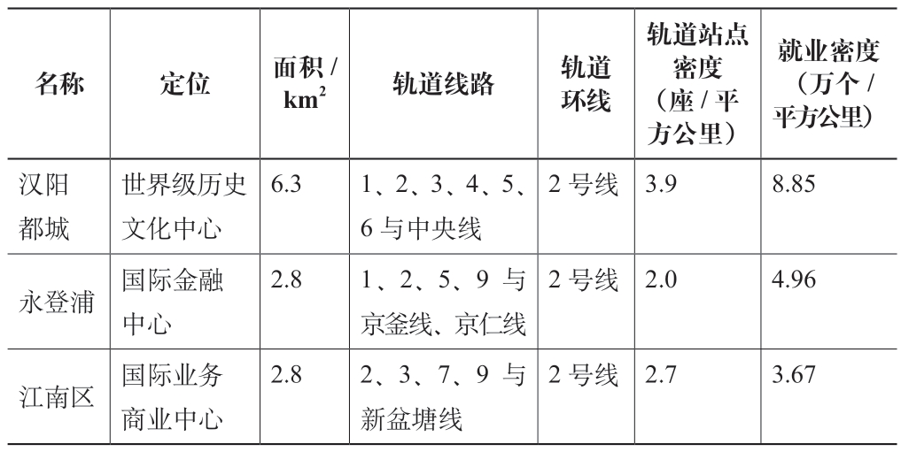 从具体的交通集散条件看,三个大都市区的中心均有发达的轨道交通网络条件:汉阳都城、永登浦、江南区三个CBD 地区的轨道站点密度分别为3.9 座/平方公里、2.0 座/平方公里和2.7 座/平方公里,且三个CBD 均有对外都市快轨线路和城市轨道环线(表6)。高速、便捷的轨道交通网络使其拥有的市场腹地明显大于其他地区。