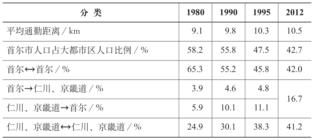 从具体的出行量分布数据来看,自1980 年以来,首尔市内部出行总量一直处于下降趋势(表5),这与整个大都市区人口总量的增长存在一定关系,但是在人均出行率指标没有太大变化的背景下,其内部出行分担率下降速率明显快于人口总量增长所稀释的增长幅度,说明首尔至大都市区外围地区的联系呈增长态势,职住分离日趋明显,平均出行距离一直处于增长态势。