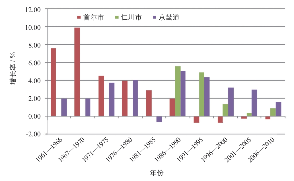 从不同地域人口变化的角度看,首尔大都市区人口呈现明显的“核心—外围”特征,即人口优先在首尔市区增长,继而呈现空间拓展特征,自中心向外延展,这一趋势自1960年代延续至1990 年代市区土地开发殆尽之时。1971—1980年间,京畿道地区开始承接首尔市区工业项目的转移,就业机会大幅增加,加之政府各项政策的鼓励,使得京畿道地区居住人口快速增长,年均增长人口达到16.4 万人;与此同时,随着首尔市区对外交通可达性的提高,首尔市作为大都市区公共服务中心的功能日趋凸显,这一时期内,首尔市拥有较大规模的待开发用地,土地开发成本整体较低,在强大的路径锁定效应下,城市发展遵循循环累积因果机制,使得首尔市区人口也出现了大幅增长的情况,首尔市年均增长人口为29.3 万人,人口数量增幅明显高于京畿道。1990 年以后,在韩国城市化率已超过80%的背景下,京畿道年均增长人口数量仍大幅提高,达到每年23.6 万人左右,以流动人口增长为主;2001—2010 年间,在韩国城市化率达到90%的背景下,京畿道年均新增人口仍达到25.9 万人,仍以流动人口为主,说明了大都市区极强的人口吸纳能力。