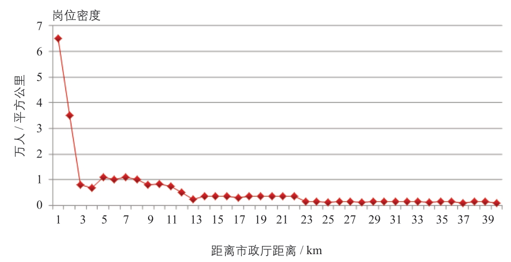 大都市区就业岗位密度呈现明显的“内高外低”特征(图5),且高密度地区主要集中在市政厅广场周边区域,随着离市政厅广场距离的增加,岗位密度急剧下降,在13 km外再次下降(图6),但幅度降低。这与首尔市区较高的土地开发强度特征基本吻合(首尔市区半径约15 km),而首尔市外围京畿道城市新区的岗位密度明显偏低。
