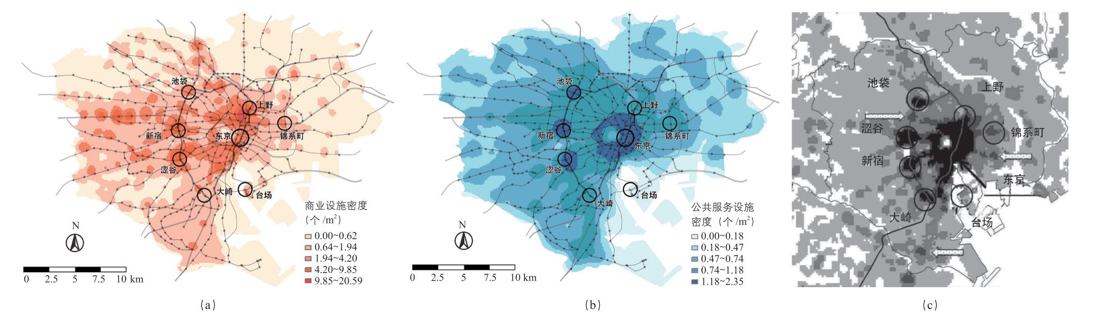 图3 东京23 区商业设施密度(a)、公共服务设施密度(b)、就业岗位密度(c)