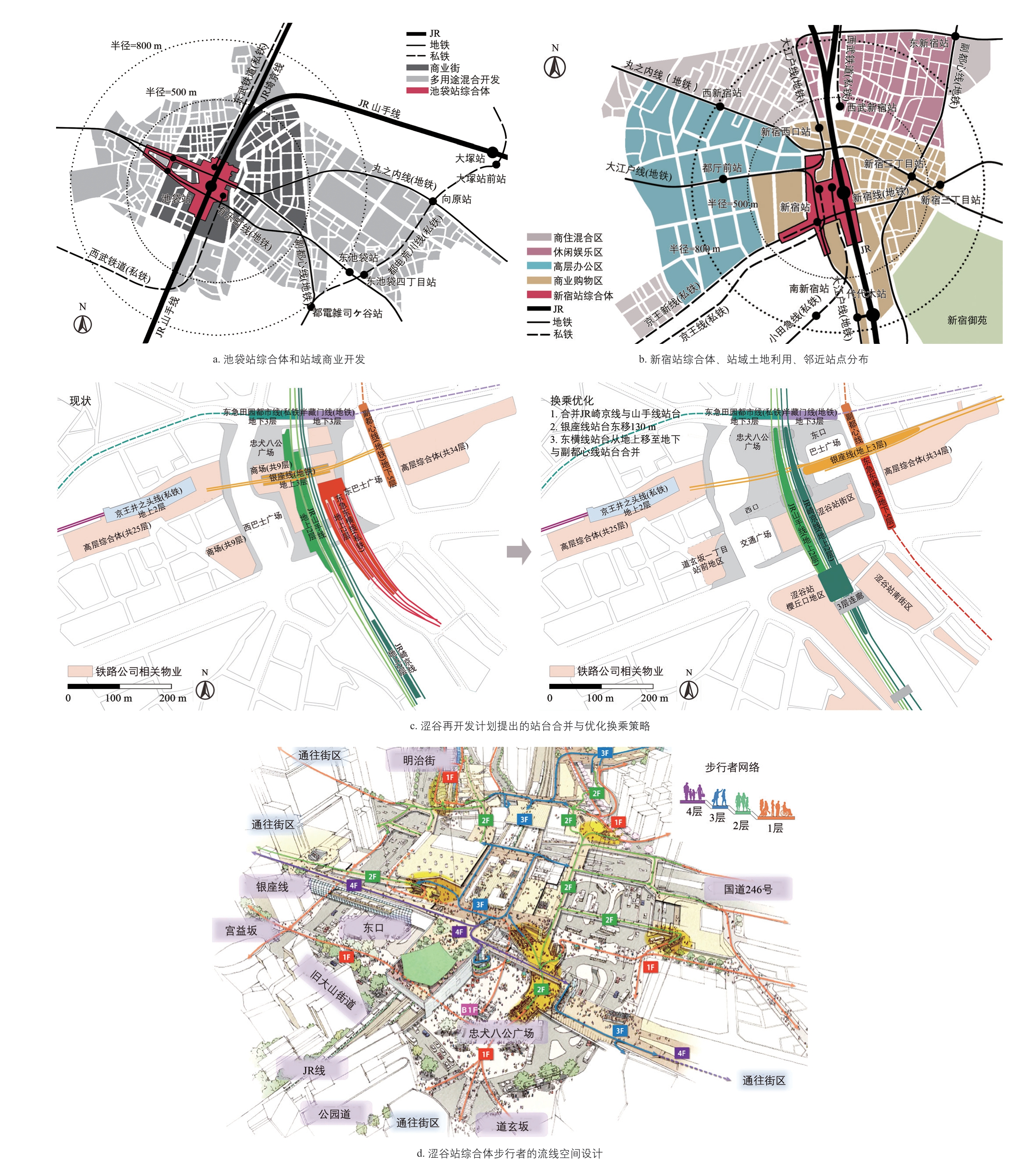 池袋、涩谷、新宿为重要的换乘枢纽站:池袋站是4 家铁路公司运营的8 条线路的停靠站;涩谷站是4 家铁路公司运营的9 条线路的停靠站;新宿站是5 家铁路公司运营的10条线路的停靠站。三个站点不仅分布着多家铁路公司的站台,还有各铁路公司的物业和百货商场;为了提升多线路换乘的便利和土地复合利用的效率,三个商业副中心通过不同类型的综合体整合了多线路换乘。池袋站通过地下街商业综合体完整串联起复合度较高的多家铁路公司站台,在地面轨道线路东西两侧,形成了以条状上盖物业为核心的放射状中高层商业街(图13a)。新宿站通过地下街和上盖巨型商业综合体整合了地铁、JR 和私铁站,并在西侧高层办公建筑群轴线末端形成下沉进站广场,与地面公交站衔接;新宿站附近的商业片区被划分为商业购物、高层办公、休闲娱乐、商住混合的不同功能(图13b)。涩谷站周边依托站点形成了具有20 m 高差变化的放射状密路网商业街;不同铁路公司线路的交叠形成了“井”字形的线网结构和多个分散化站台,虽然这些站台可经由物业综合体串联,但仍然存在站台间换乘不便的问题,为此政府推出了涩谷再开发计划,提出合并站台优化换乘(图13c)、实现不同铁路公司合作的直通运行、加建高层商业建筑、营造涩谷川滨水公共空间的综合开发措施[38]。三个站点综合体的商业设施布局还充分考虑了换乘人流的方向和商业潜力,如餐厅、超市和零售店铺主要在站台层的人流通道两侧设置,而大型商场则位于垂直于地面的上盖物业中(图13d)。