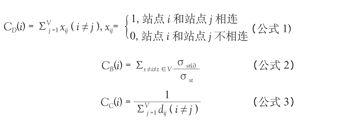 此外,复杂网络中的度中心性CD(i)用于刻画节点重要性,表示一个节点与其他所有节点相联系的程度,本文用站点i 所联系的其他所有站点数目表示(公式1)。介数中心性CB(i)反映了节点作为桥梁的重要性,用经过站点i 的最短路径σst(i)占所有站点OD 矩阵的最短路径σst 的比例表示(公式2)。接近中心性CC(i)用于刻画节点在地理空间上的可达性,用站点i 到其他所有站点的最短轨道交通网络距离dij 之和的倒数表示(公式3)。当在python 中输入488 个轨道交通站点空间拓扑关系的网络图,并基于实际轨道交通线网距离进行边的加权后,可调用复杂网络分析库Network X 计算所有站点的三种中心性。
