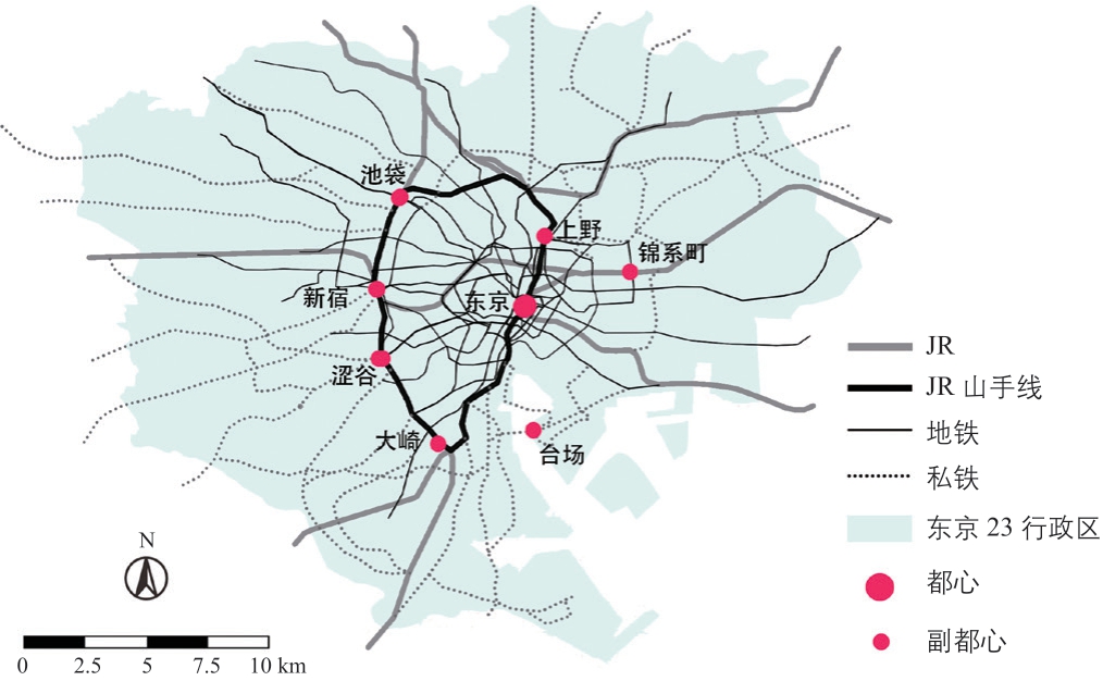 图1 东京23 区轨道交通网络系统及都心和副都心
