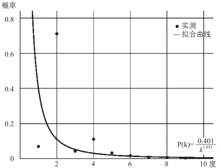 在由E 条边和V 个节点组成的交通网络G=(E,V)中,无尺度网络的特征是网络节点的度d(等于该节点所连接边的数量)符合幂律分布,即P(d=k)