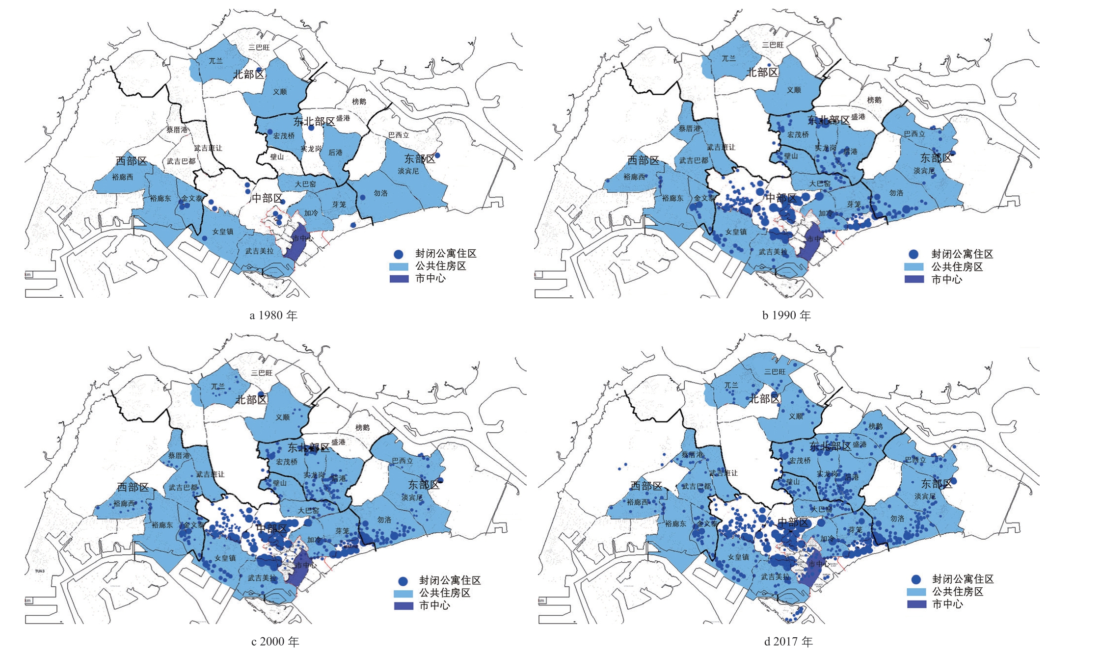 新加坡继承了殖民时代不同种族、收入群体分区居住的传统[15],其中富人集中的有地住宅区域在二战以前已经形成。最初,封闭公寓社区通常选址于城市中心区附近的优质居住地段,到1980 年,2/3 的私人公寓集中在这些区域[20](图2a);之后随着高速公路的发展,公寓项目开始出现在地价较低的外围地区和郊区,东至勿洛、西至金文泰一带的公寓开发已很普遍[15](图2b),使得城市居住景观发生了非常明显的变化。