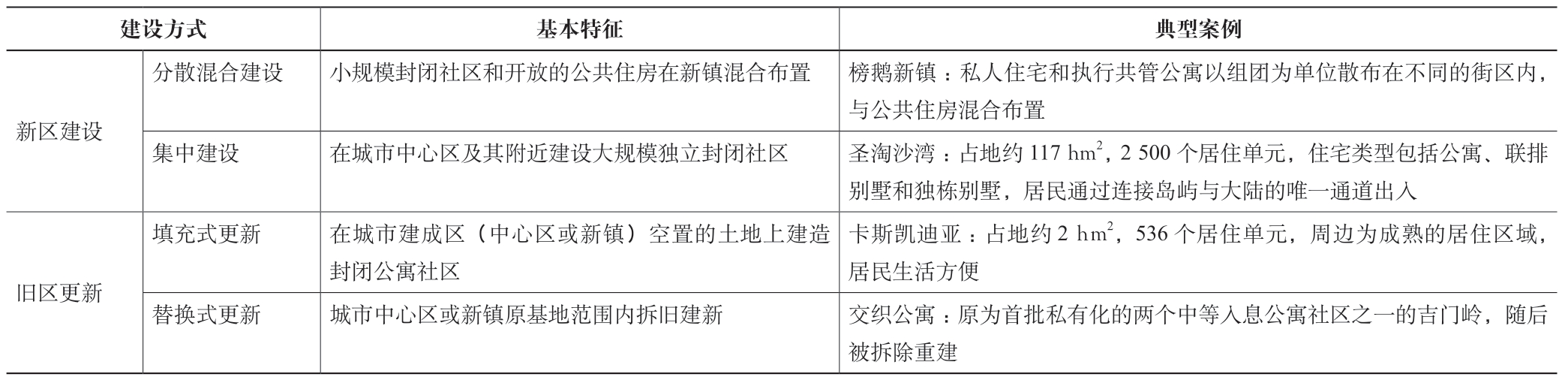 对于新区建设,新加坡封闭公寓社区采取分散混合建设与集中建设两种方式;对于旧区开发,主要有填充式更新与替换式更新两种方式(表2)。从时间维度来看,早期多采取填充式或替换式更新的方式,与有地住宅一起形成富人集中的高档居住片区;此后,开始在中心区或新镇公共住房以外的专门地段建造;1990 年代左右,在新镇内出现了与公共住房混合建设的方式,此外随着老旧住房升级计划的实施,越来越多地使用替换式更新的方式;21 世纪以来,上述各种建设方式都在继续应用,城市中心及附近区域则出现了大规模集中建设方式。