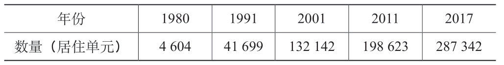 1996 年以来,其他类别的私人住房存量都有所下降(图1),而公寓存量却大大增加——到2017 年第三季度达到了287 342 个居住单元(表1)。这一时期的发展还体现在社区规模与品牌打造方面:有更多的大型封闭社区建成,并且不乏国外著名建筑师的设计作品。这些高端住宅项目吸引了大量国外投资,如滨海舫(Sail@Marina Bay)40%的公寓为外国人所购买,圣淘沙湾则有一半以上的豪宅卖给了富有的外国人[17]。