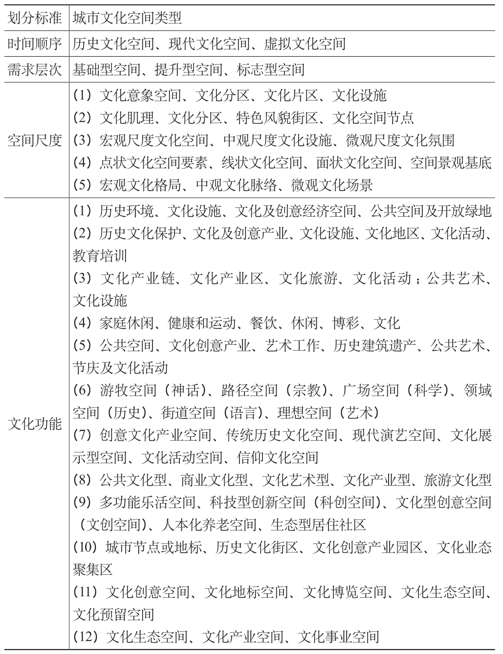 由于当前城市功能的多样化和市民追求文化的多维度,城市文化空间的类型丰富多元,规划学者们对城市文化空间划分的标准、尺度也不同(表1),这一方面体现了城市文化空间研究和规划的多层次、多角度,但另一方面不利于对文化空间内涵进行整体性辨析,造成以文化空间为对象的规划边界不明确、标准不统一等矛盾冲突。
