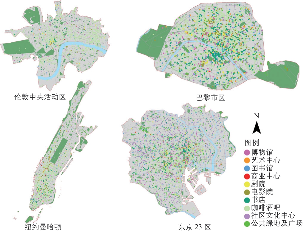 图4 伦敦、纽约、巴黎、东京基础型文化设施分布图