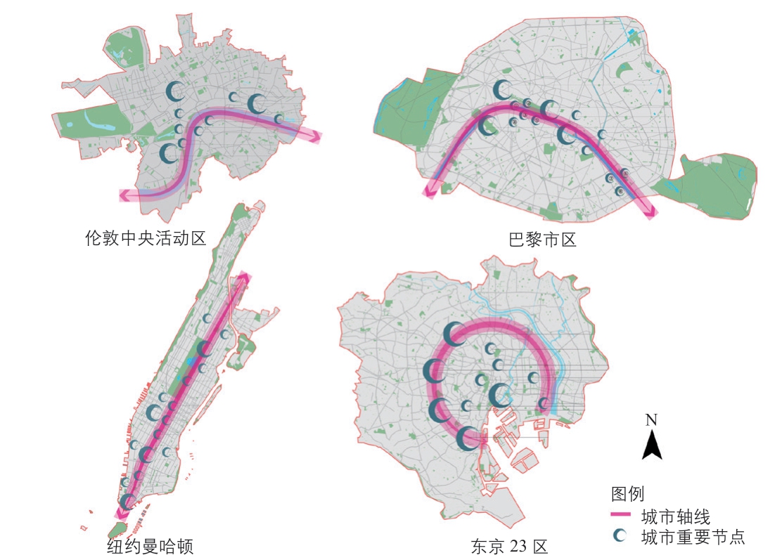 图2 伦敦、纽约、巴黎、东京城市轴线示意图