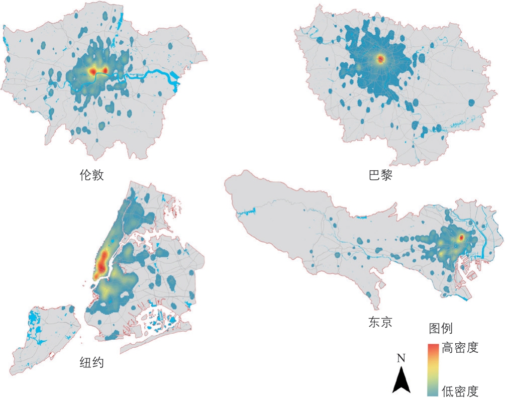 图1 伦敦、纽约、巴黎、东京文化空间核密度分析图