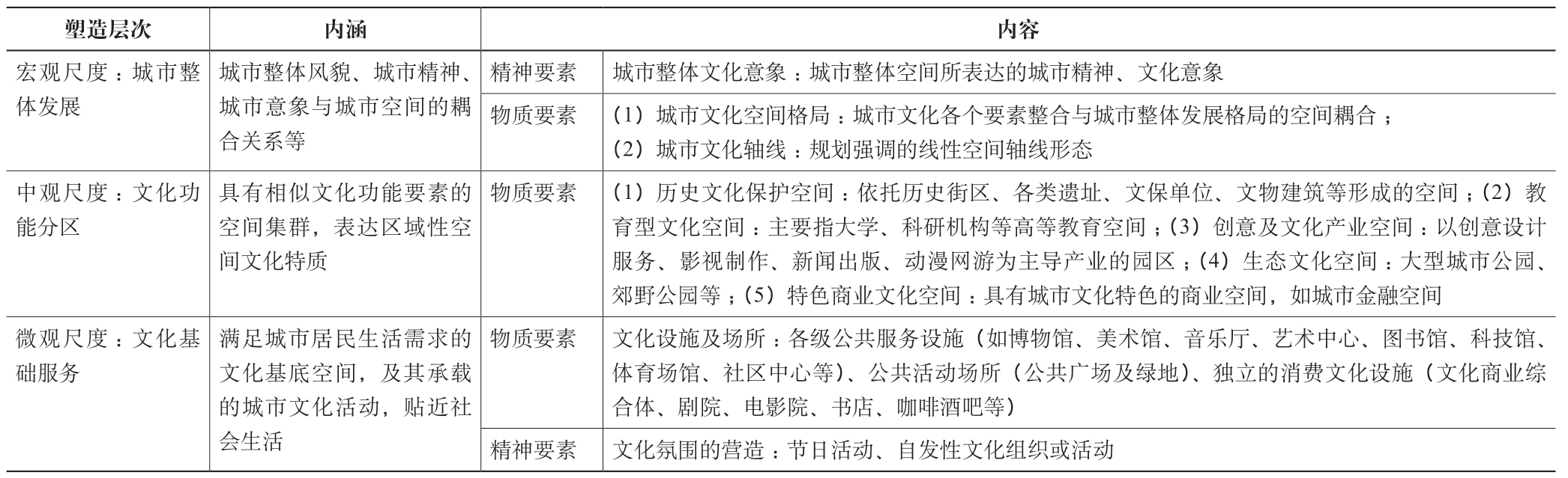 考虑到文化空间不仅具有尺度和时间特征,还兼具功能性和需求度,为形成统一的研究标准,参考表1 对现有文化空间各样化分类方法的梳理和辨析,并结合文化规划“从宏观到微观、引导城市整体发展”[21]的多层次目标,本文将城市文化空间界定为城市整体发展、文化功能分区、文化基础服务三个层次(表3),包含文化空间的城市建设物质要素及其所承载的城市文化精神要素。