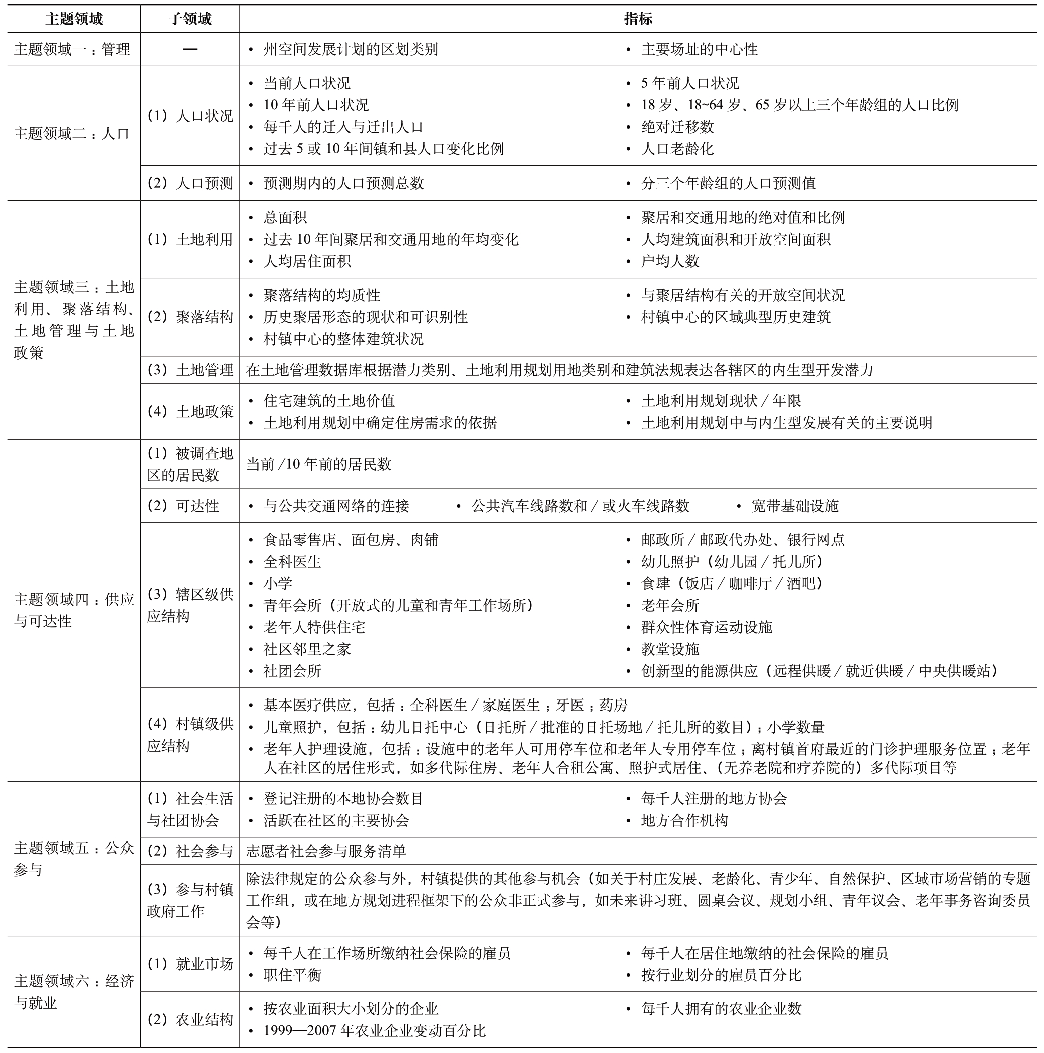 村镇活力测评的评价指标涵盖管理、人口、用地、供应与可达性、公众参与、经济与就业六大主题领域(表2)[13]28-36。