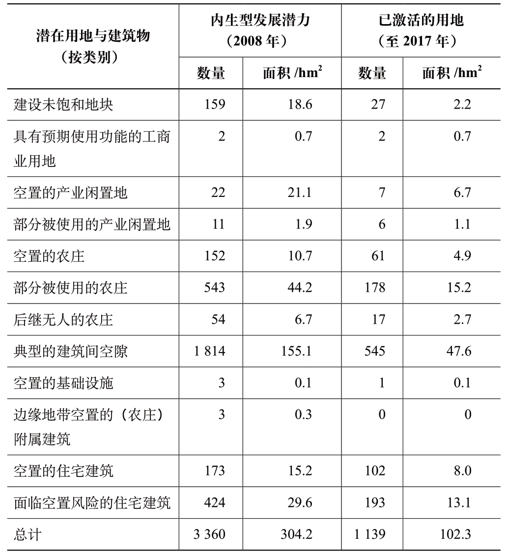 表4 2008—2017 年跨村镇联盟“上韦恩河谷”内生型发展潜力测评与激活用地数
