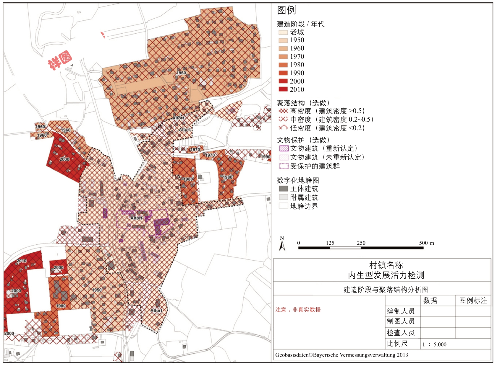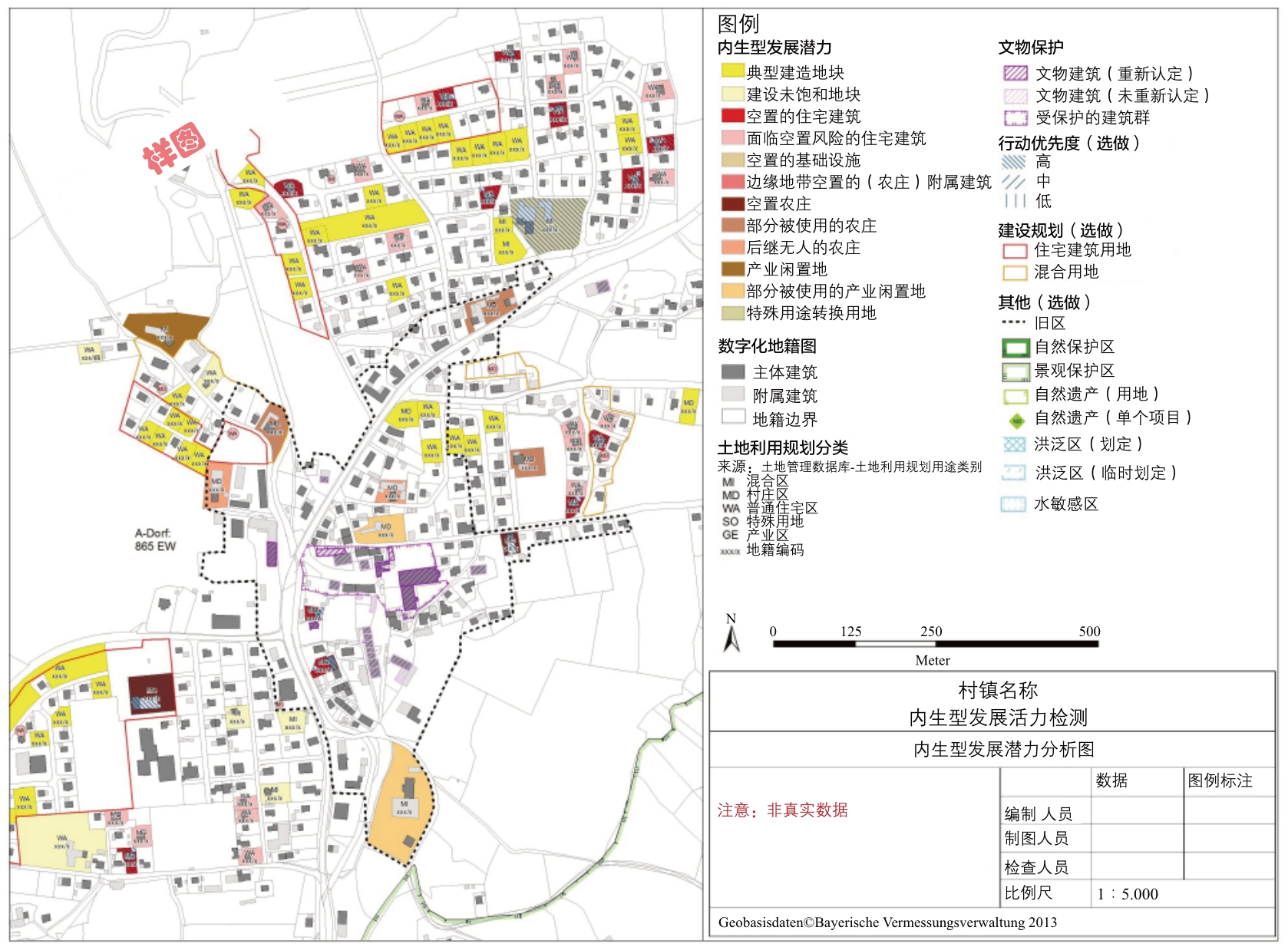 巴伐利亚州环境厅(LfU)开发的土地管理数据库为乡村活力测评提供了每一个地基的数据,包括地基标注、地籍编码、街道和门牌号、建筑类型、根据土地利用规划的用途类型、建筑法规要求、面积等信息。