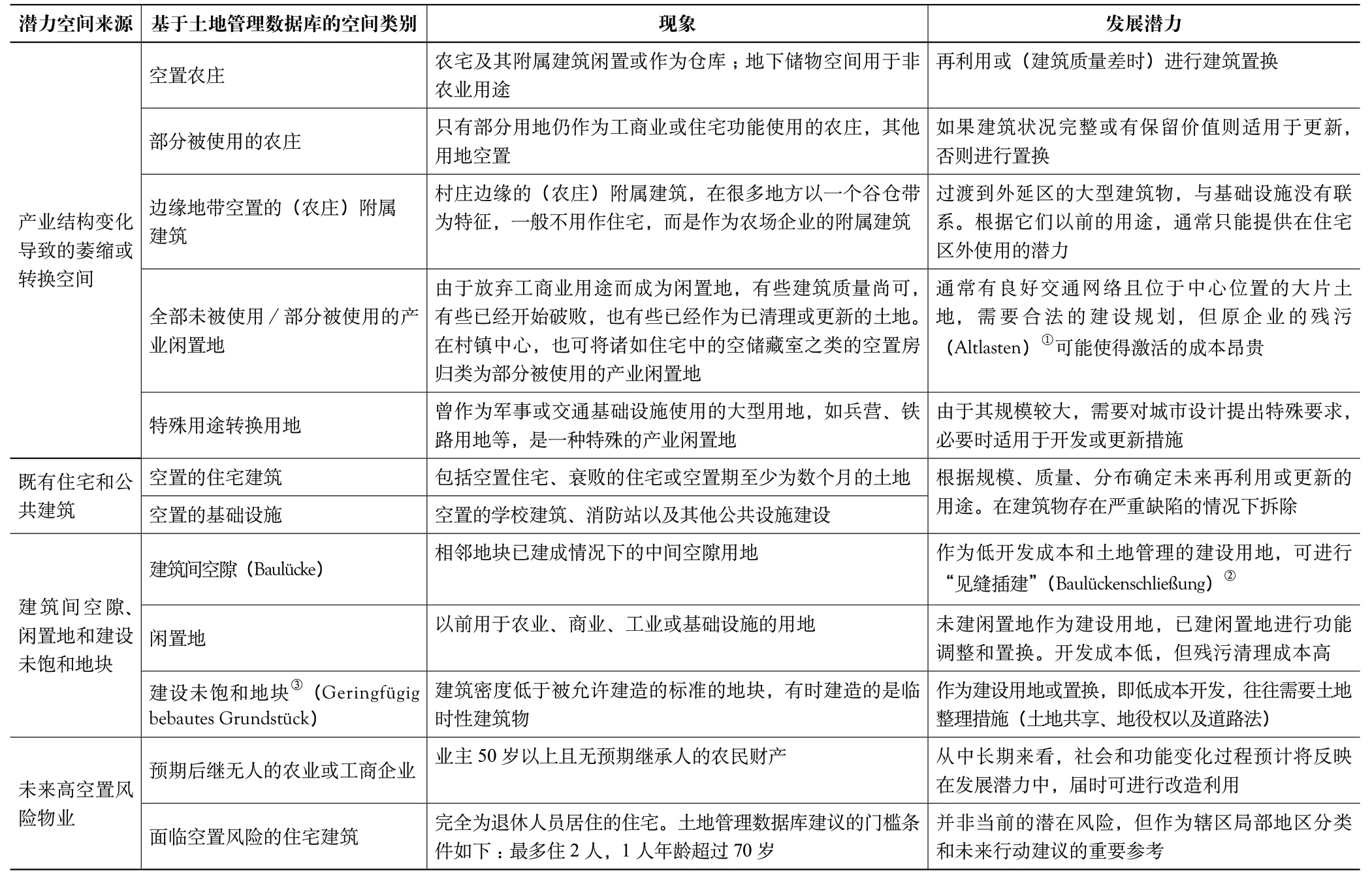 (2)充分挖掘潜力空间资源。内生型发展的本质之一是充分利用本地资源,村镇活力测评严格遵循联邦与州确定的“内生型发展优于外延型发展”的战略目标,通过对乡村用地和房屋资源的详细清查和盘点,在不增加新建设区的前提下,充分挖掘存量潜力空间,也预测未来可能出现的空置风险空间位置,以详细的类别记录在土地管理数据库中,为乡村盘活既有资源、实现精明收缩提供物质空间基础。其中闲置地、建筑间空隙、建设未饱和地块等德国特有的空间规划术语,对于中国存量规划时代的乡村乃至城市的精细化更新都具有重要借鉴意义。