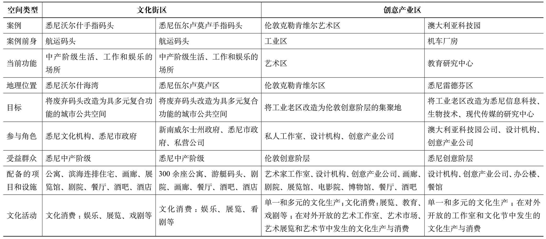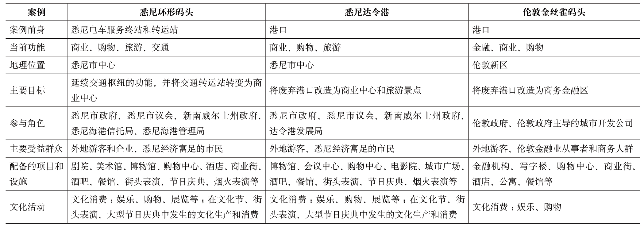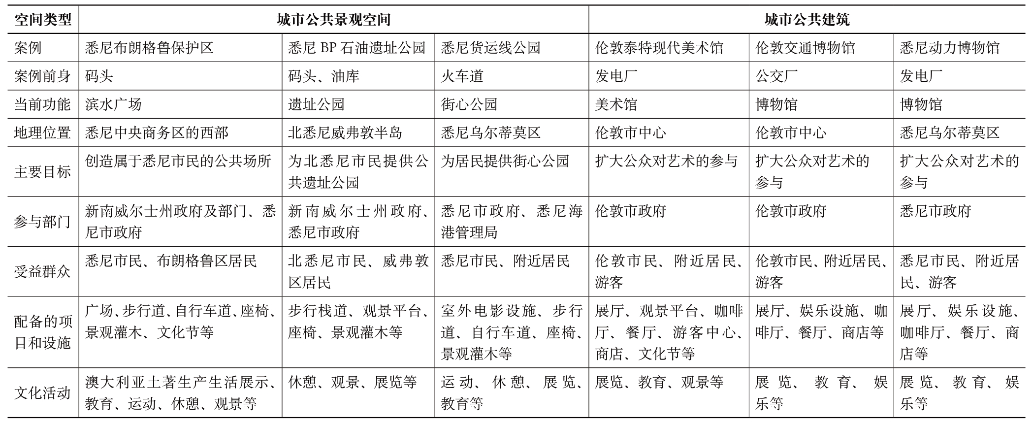 综合以上研究,本文将格罗达克和卢凯特-斯德里斯提出的文化策略四方面特征扩展为七个方面:对应的空间类型、所产生的潜在效益、具体目标、参与角色、受益群众、配备的文化项目和设施,以及文化活动。在此基础上,下文结合伦敦和悉尼的实践案例,对改进式、创意式和商业式三种文化策略的具体特征展开讨论。