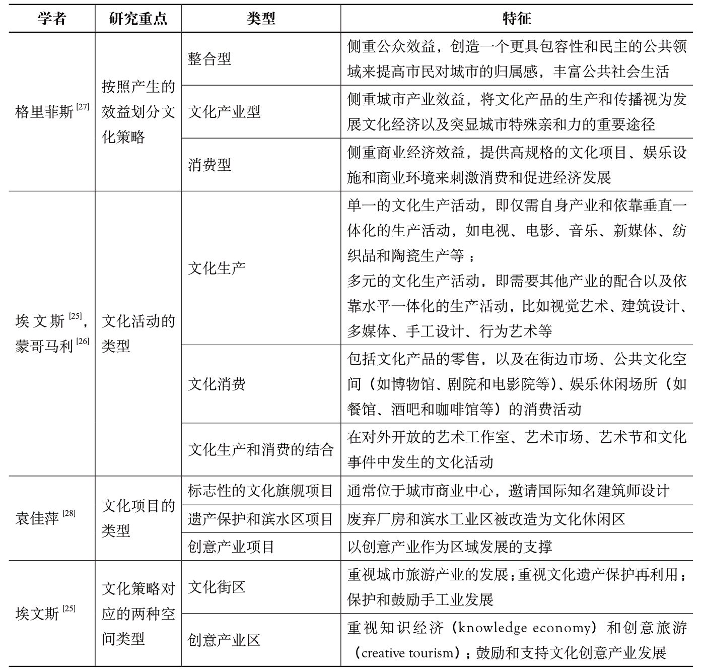 这三类文化策略被中外学者广泛引用[17,24]。但是,有的西方学者认为对文化策略的研究应该考虑更多方面的特征,比如建筑空间类型[25]、文化活动[25-26]、潜在的效益侧重[27]和文化项目[28](表2)。