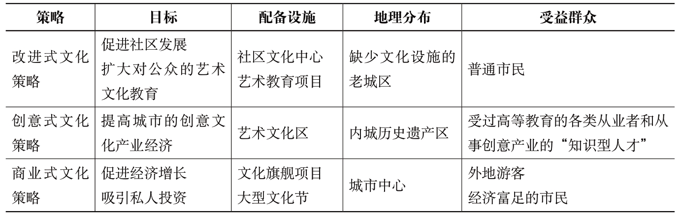 在西方的理论研究和实践中,对于城市更新中文化策略扮演的角色和发挥的作用有着比较明确和系统的区分。格罗达克和卢凯特-斯德里斯(Grodach &Loukaitou-Sideris)归纳出城市更新的改进式(progressive strategy)、创意式(creative strategy)和商业式(entrepreneurial strategy)三种文化策略[23]。他们对文化策略分类的标准主要考虑四个方面的特征:目标、配备设施、地理分布和受益群众(表1)。